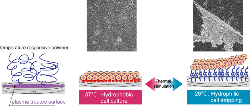 Plasma-treated PET is modified with a temperature-responsive polymer, and cells grown on it are gently detached and collected by applying a temperature stimulus.